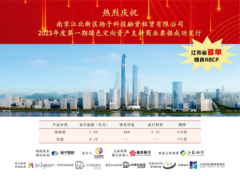 强化融资租赁和商业保理业务,成功发行全省首单绿色资产支持商业票据、全省首单保理公司公募资产支持商业票据(ABCP),助力南京建设科创金融改革试验区。依托新区“双区叠加”的创新资源集成优势,运用区块链等先进技术,建成扬子江数字金融基础设施平台,推出“专利通”知识产权资产证券化等一系列创新金融产品。