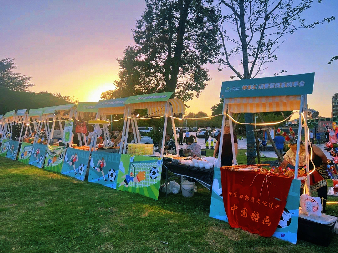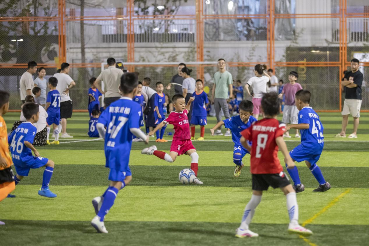 7 月 20 日赛事开幕当晚,《绿茵桑巴战舞》开场表演为少年征途擂响战鼓,特邀嘉宾亲临现场,为赛事启幕点燃纯真足球梦想;七桥瓮公园金陵摩天球,照亮少年逐梦征途。曾获省长杯两连冠的鼓楼区第一中心小学打响揭幕热身赛,尽显未来之星的风采。明外郭百里风光带化身 “全域沉浸式体验场”,现场设置休息区、舞台区、趣味互动足球游戏区及市集区。舞台区配备户外大屏,同步直播当日南京对阵扬州的苏超赛事;市集区汇聚各类特色小吃,亦有非遗糖画、捏面人等传统技艺展示,可让观众领略非遗文化魅力,同时特别邀请江苏省供销合作社入驻,带来新鲜农产品,让观众在观赛之余尽享采购乐趣。