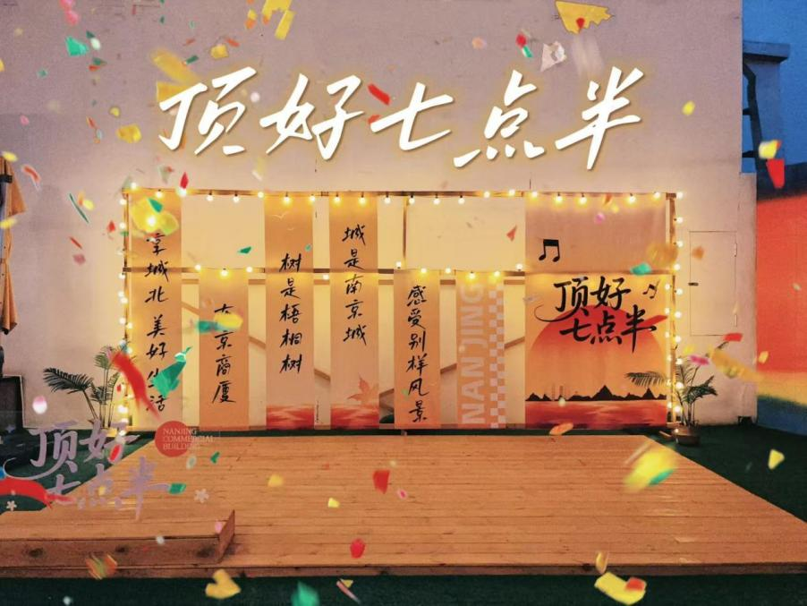 同步推进的5楼天台改造项目“顶好7点半”,定位为高品质的城市慢生活休闲空间,以大面积彩绘融入夕阳与南京城景元素,通过设置舞台并举办音乐会、乐队驻场等文化活动,以“晚间7点半”为号角,培育城市夜间文娱消费新习惯,逐步打造连接市民夜间休闲与社交体验的“城市客厅”。